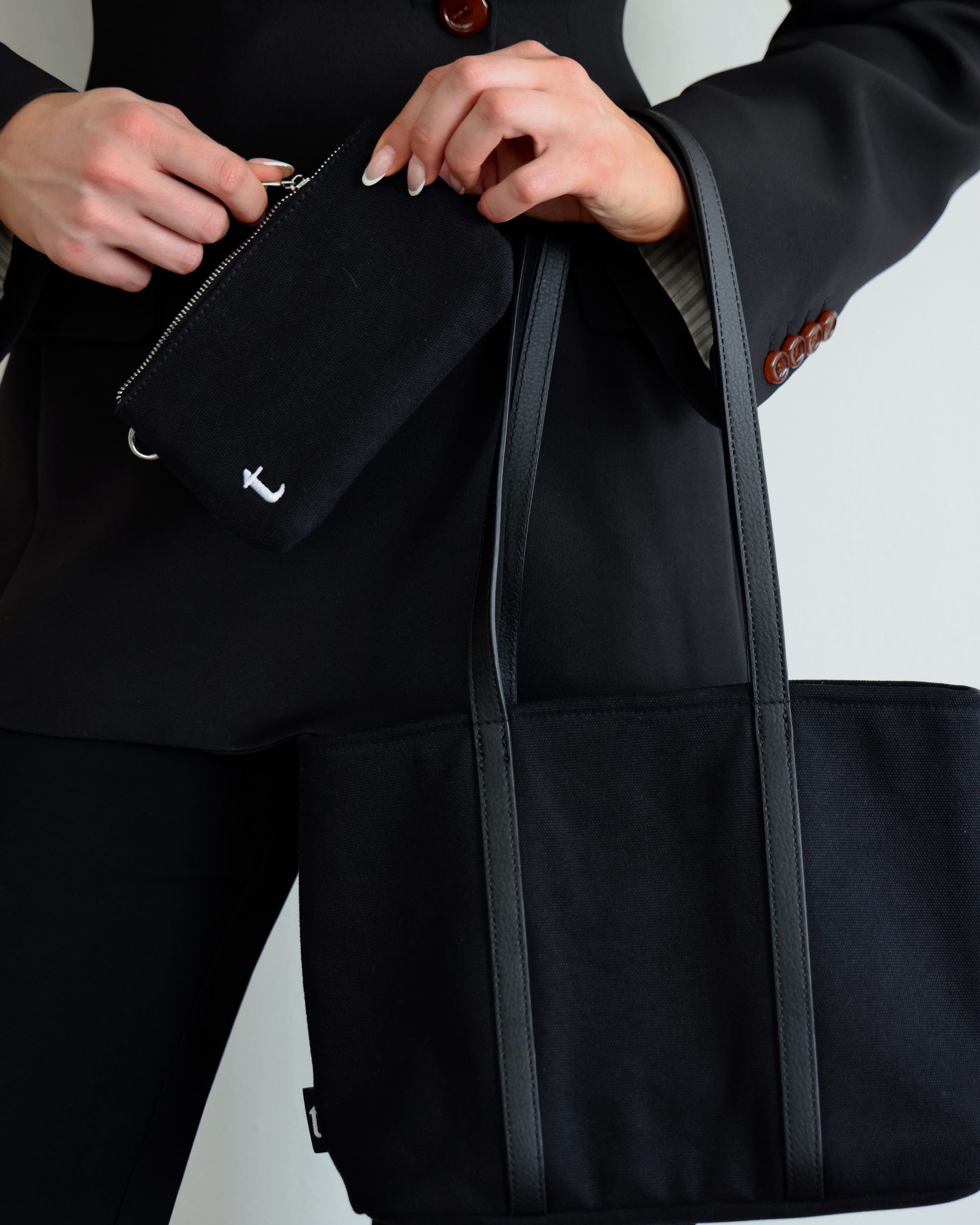 Meet the Everyday Tote in black, this canvas tote bag is crafted from durable cotton canvas with apple leather straps for a refined yet minimalist look. Designed to go with everything, it features a removable pouch with apple leather card slots, perfect for keeping your essentials organized on the move. Your new go to bag - for workdays, weekends, and everything in between.
